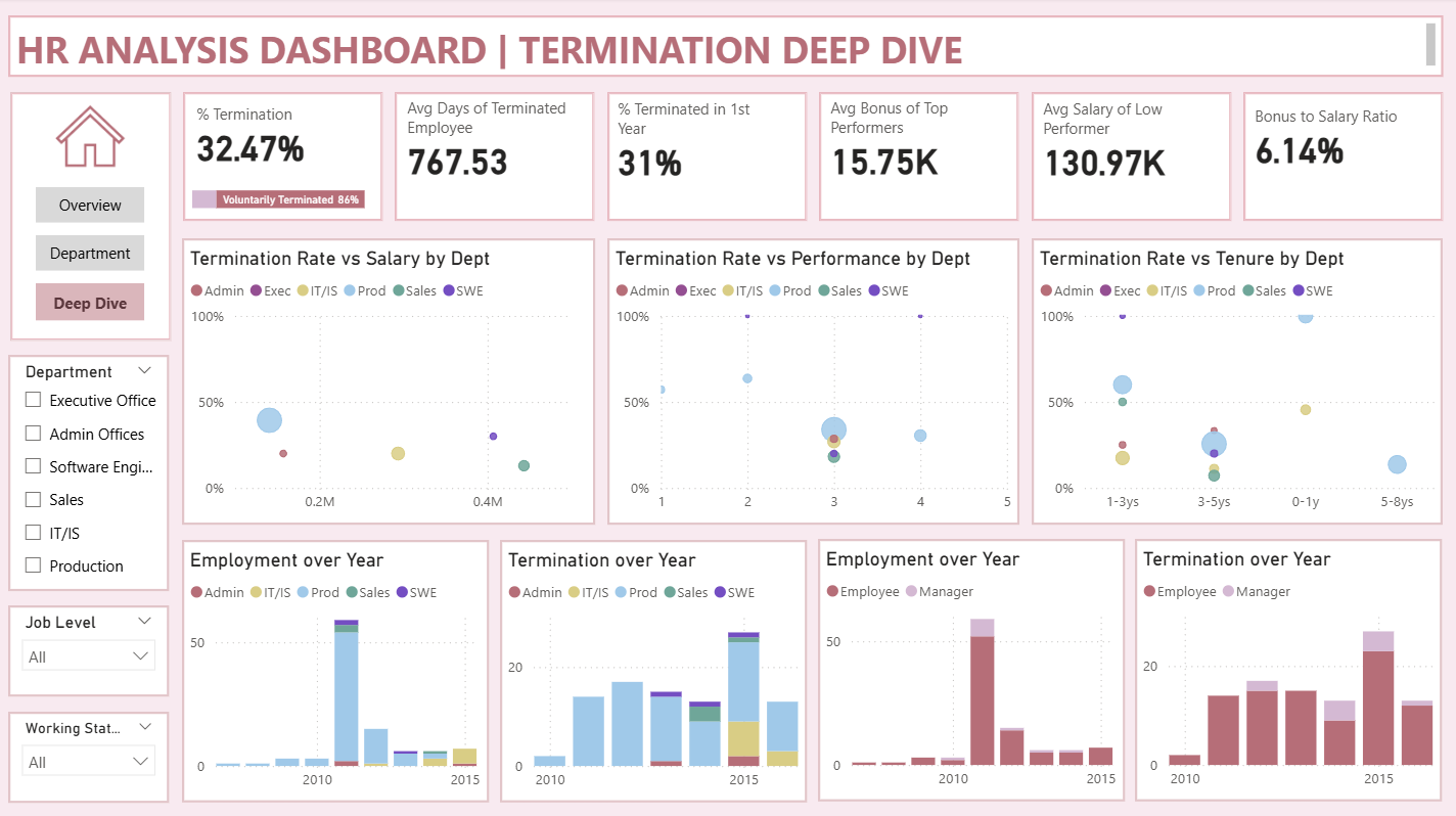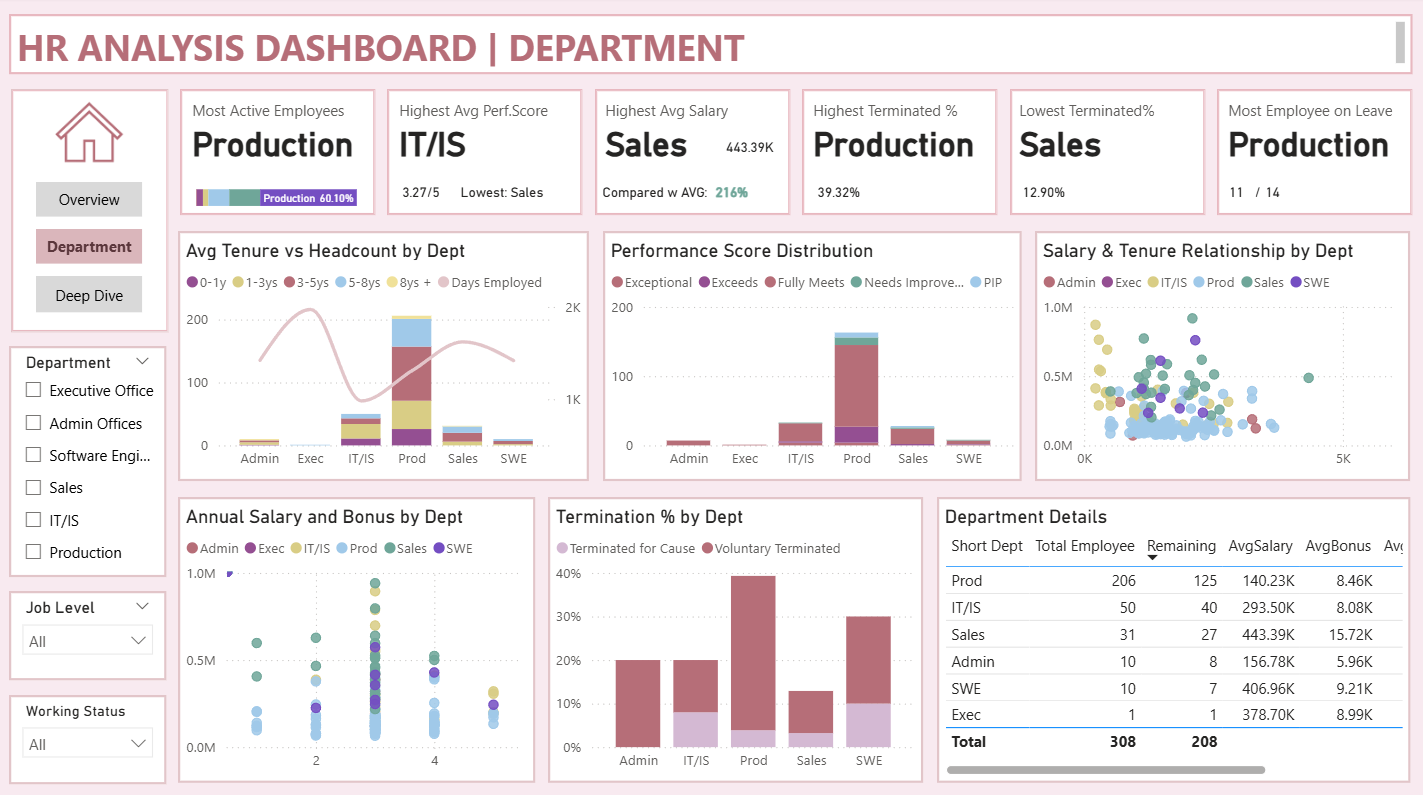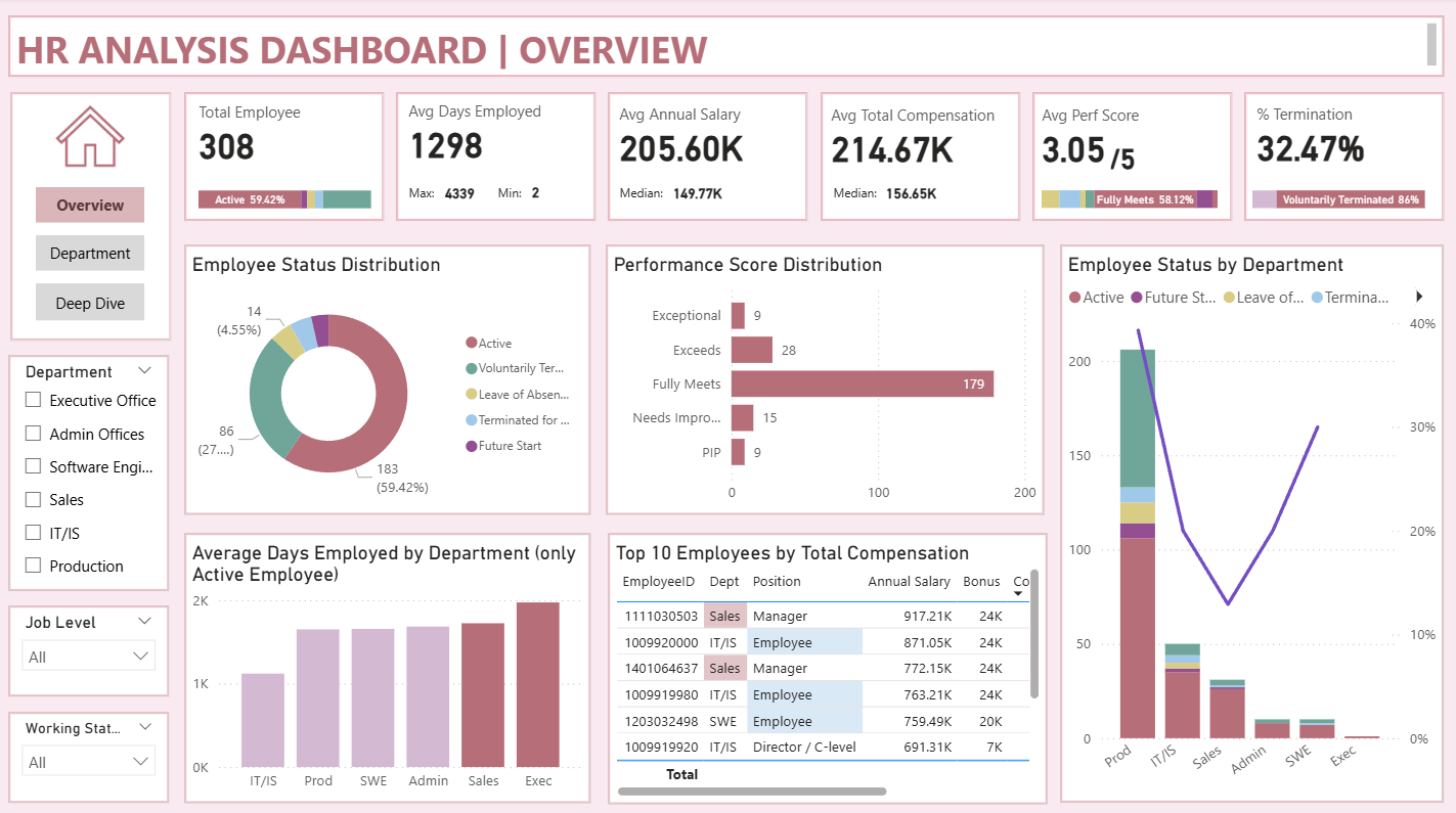 Analyze & visualize workforce trends in Power BI across departments and positions.