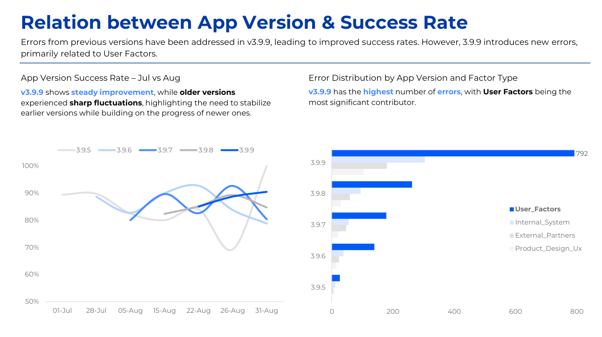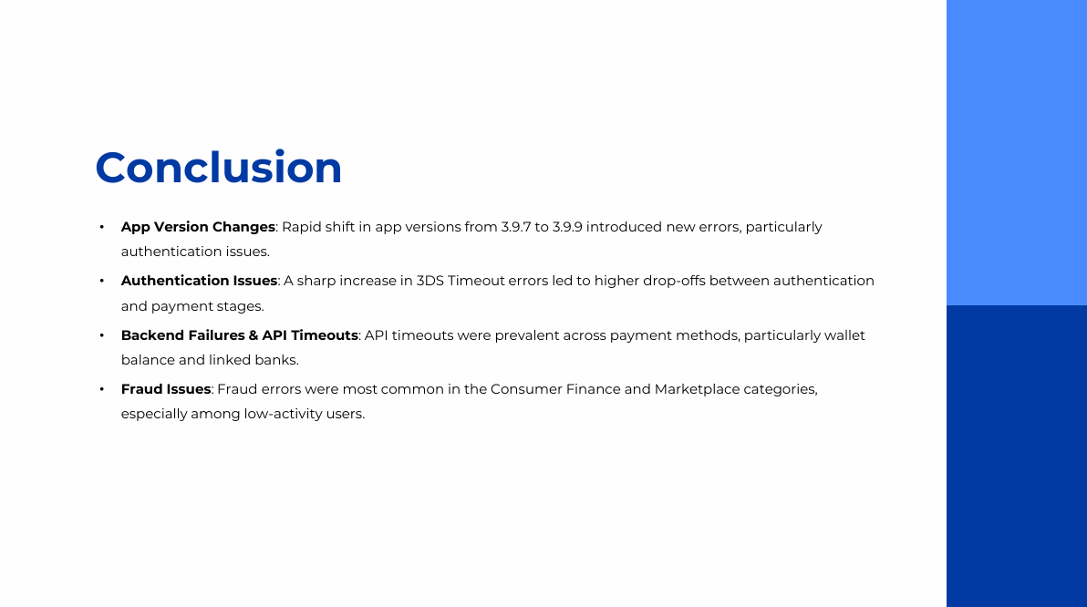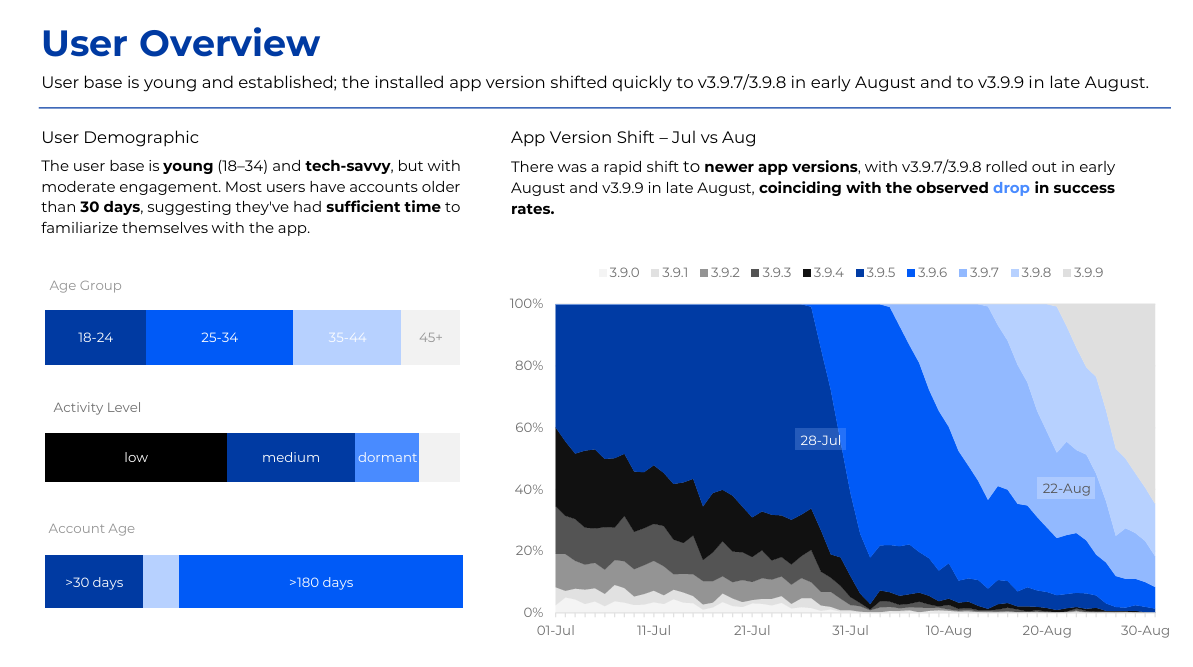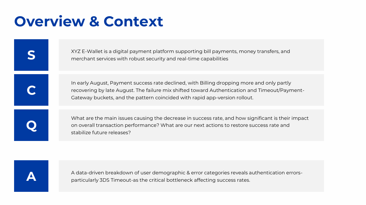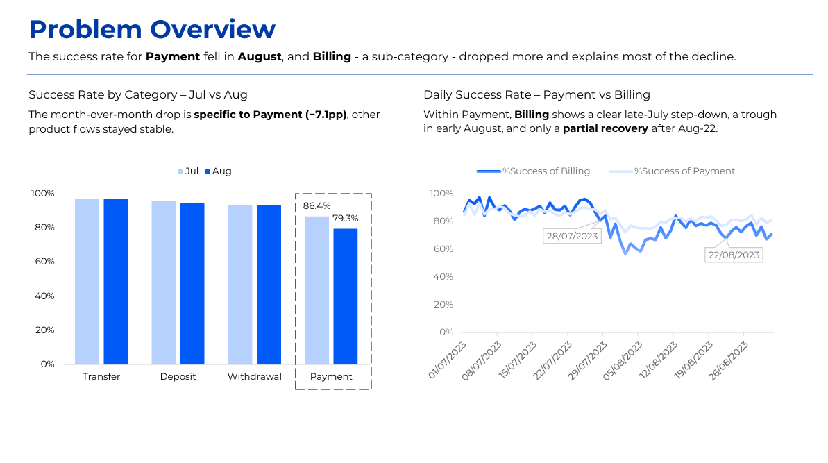 The project analyzes the decline in bill payment success rate on an e-wallet app since August 2025 using transactional, session, event log, and error data. Power BI and the MECE framework were applied to identify failure points across the payment journey, including authentication, gateway redirects, and app version issues. Key insights highlighted correlations between failure rates and user segments, device types, and network quality. The analysis led to actionable recommendations to optimize payment flows and reduce error impact.
