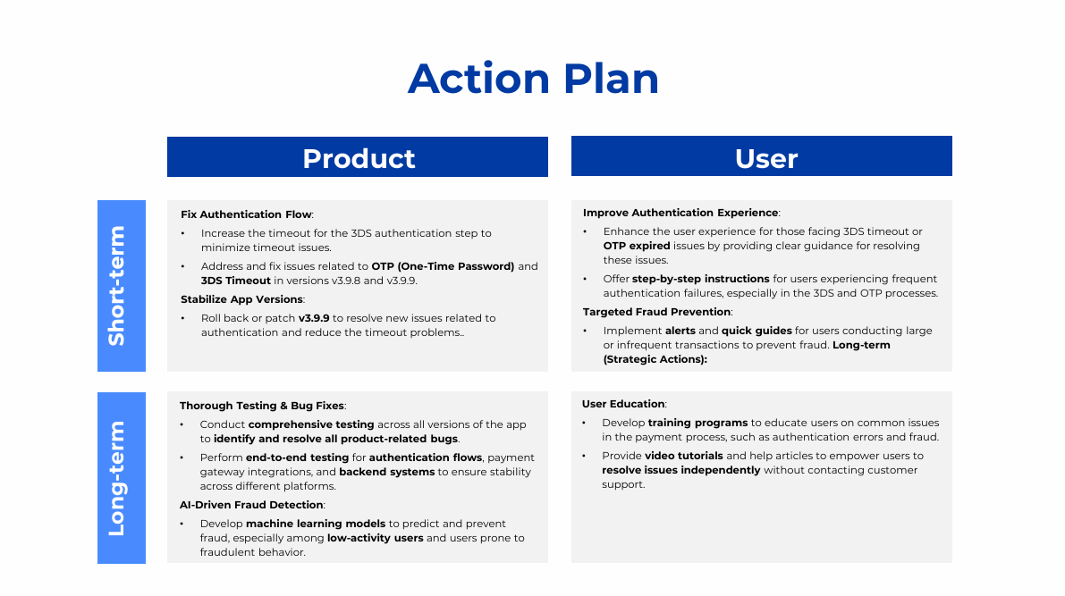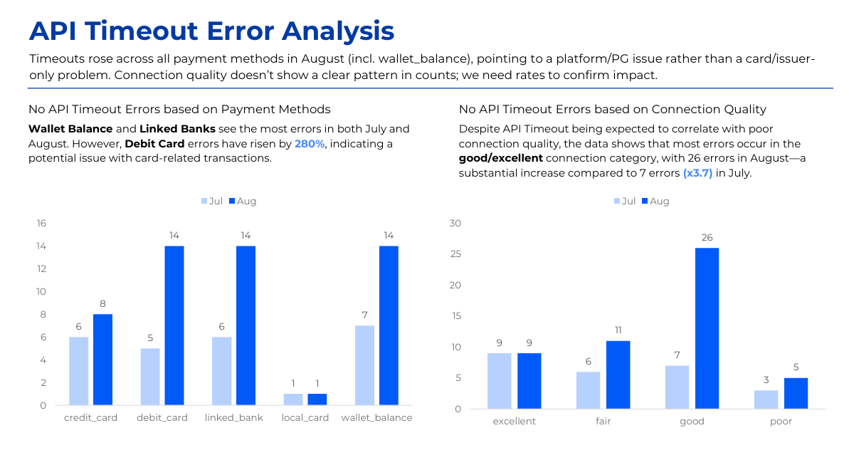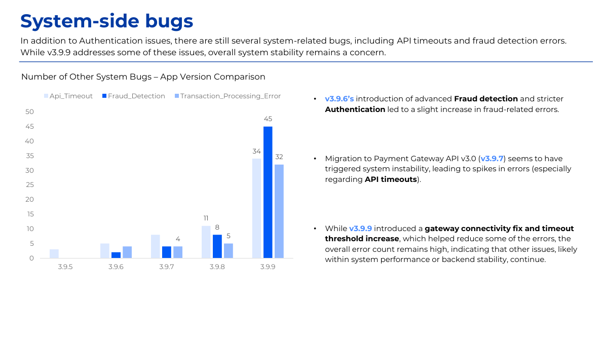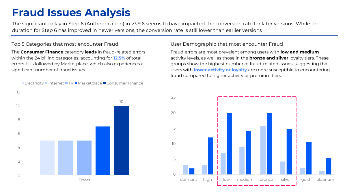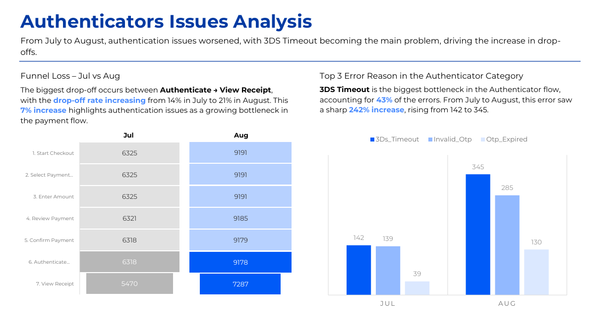 The project analyzes the decline in bill payment success rate on an e-wallet app since August 2025 using transactional, session, event log, and error data. Power BI and the MECE framework were applied to identify failure points across the payment journey, including authentication, gateway redirects, and app version issues. Key insights highlighted correlations between failure rates and user segments, device types, and network quality. The analysis led to actionable recommendations to optimize payment flows and reduce error impact.