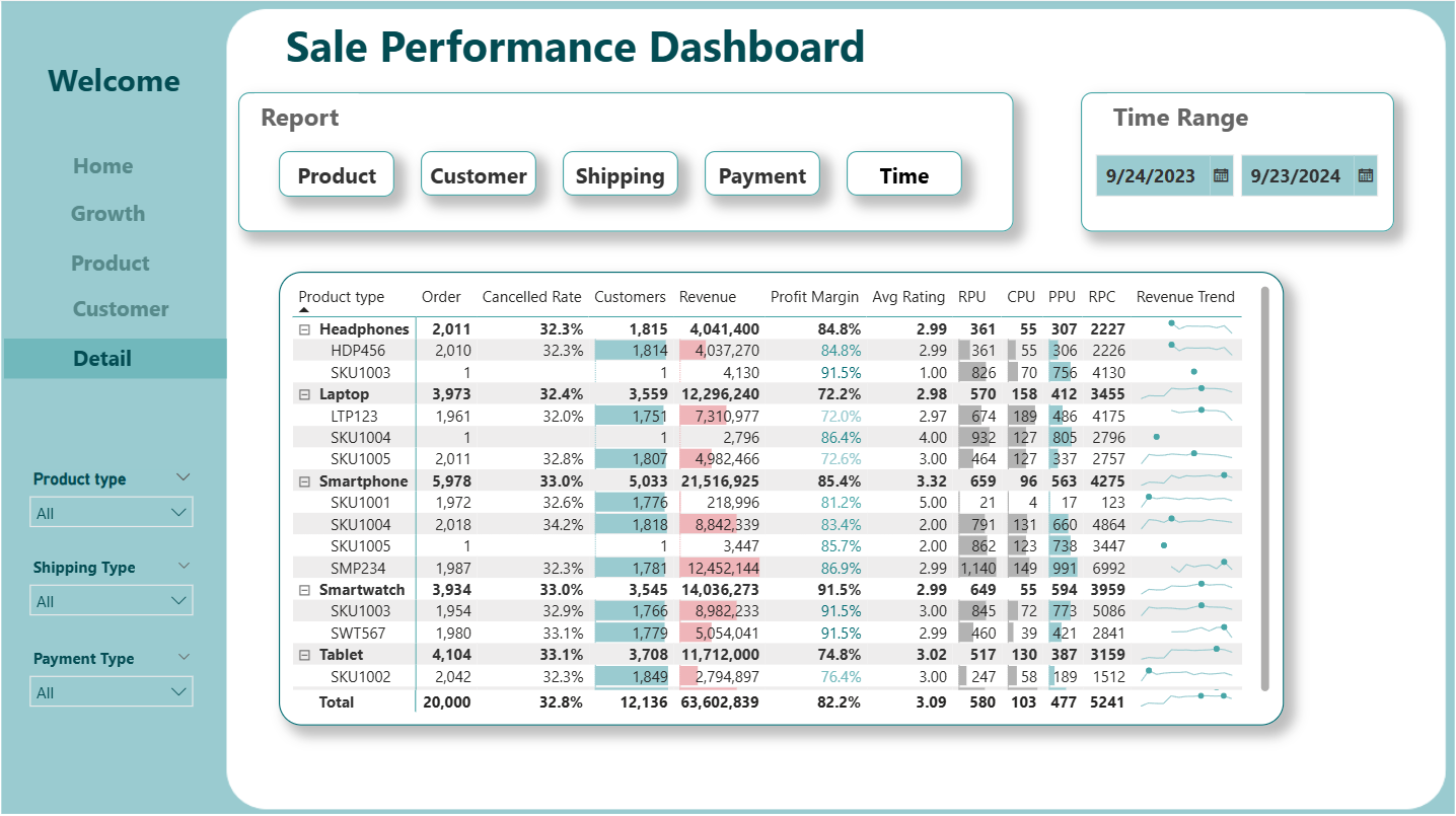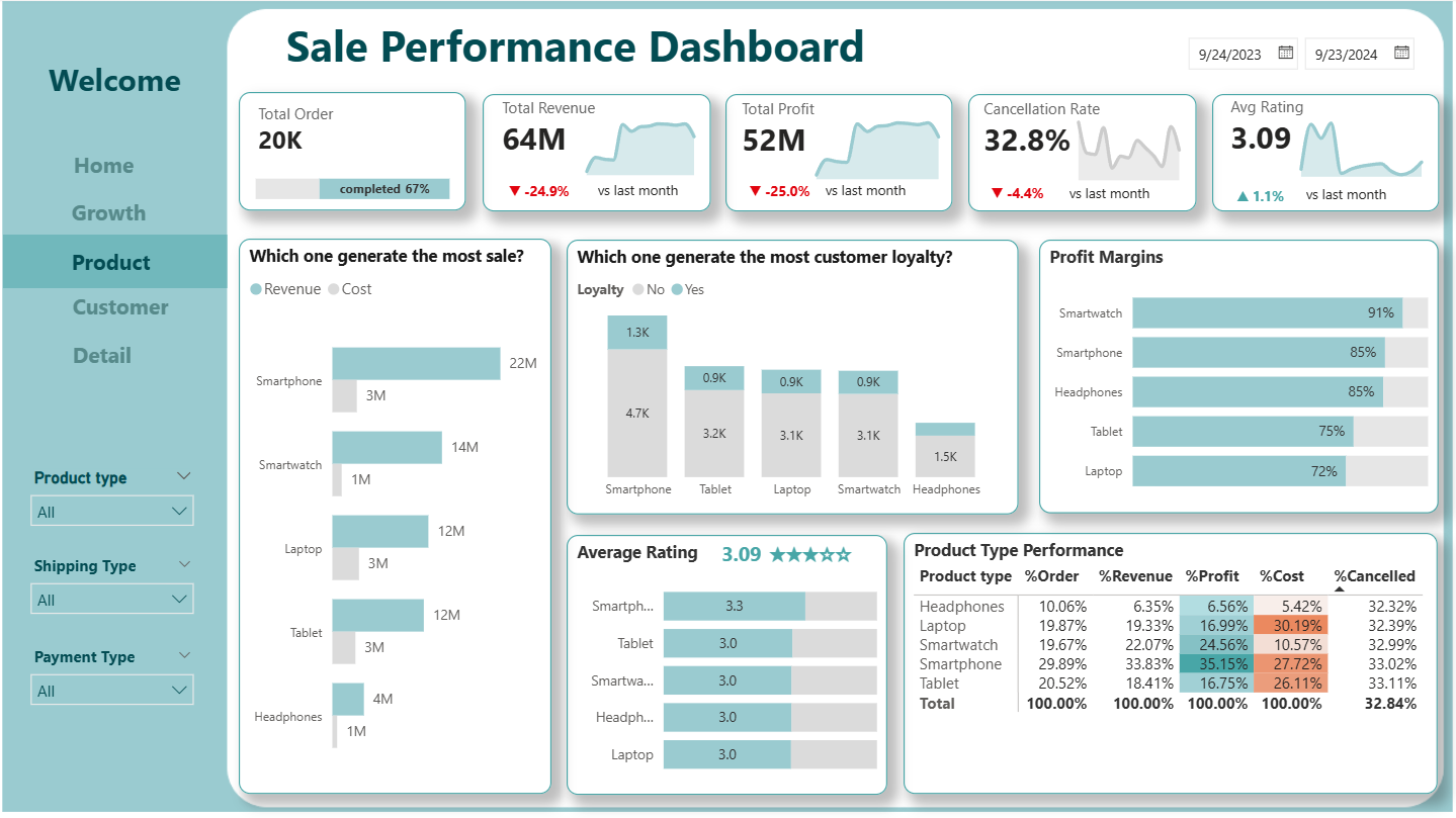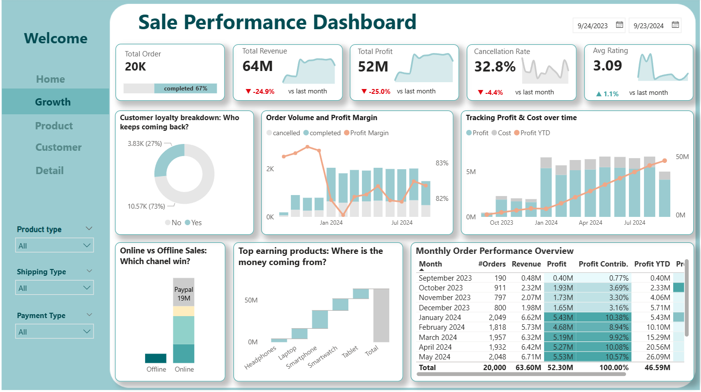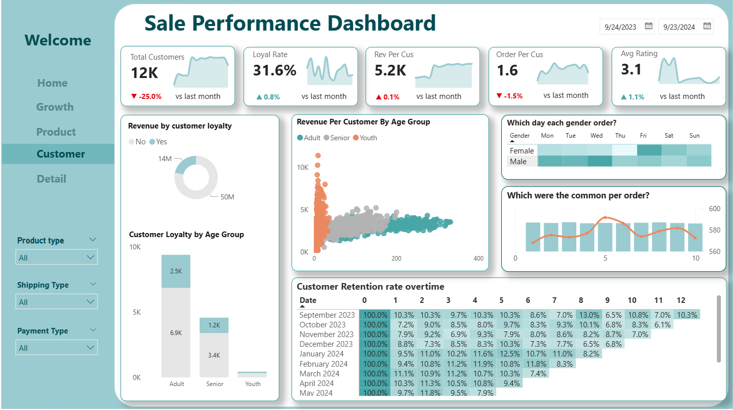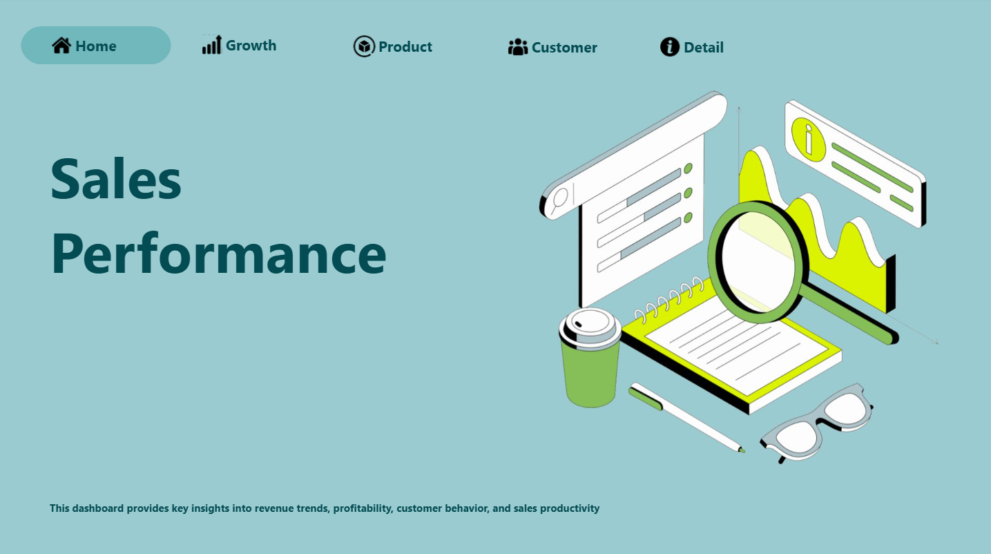 The project presents a sales performance dashboard built with Power BI to explore business trends and customer behavior. It provides a holistic view of sales performance across products, customer segments, and time periods. The dashboard uncovers insights related to growth, loyalty, and operational efficiency. Interactive visualizations support deeper exploration and faster decision-making. The analysis helps optimize strategies and improve overall business outcomes.