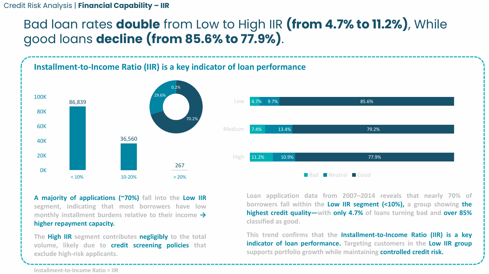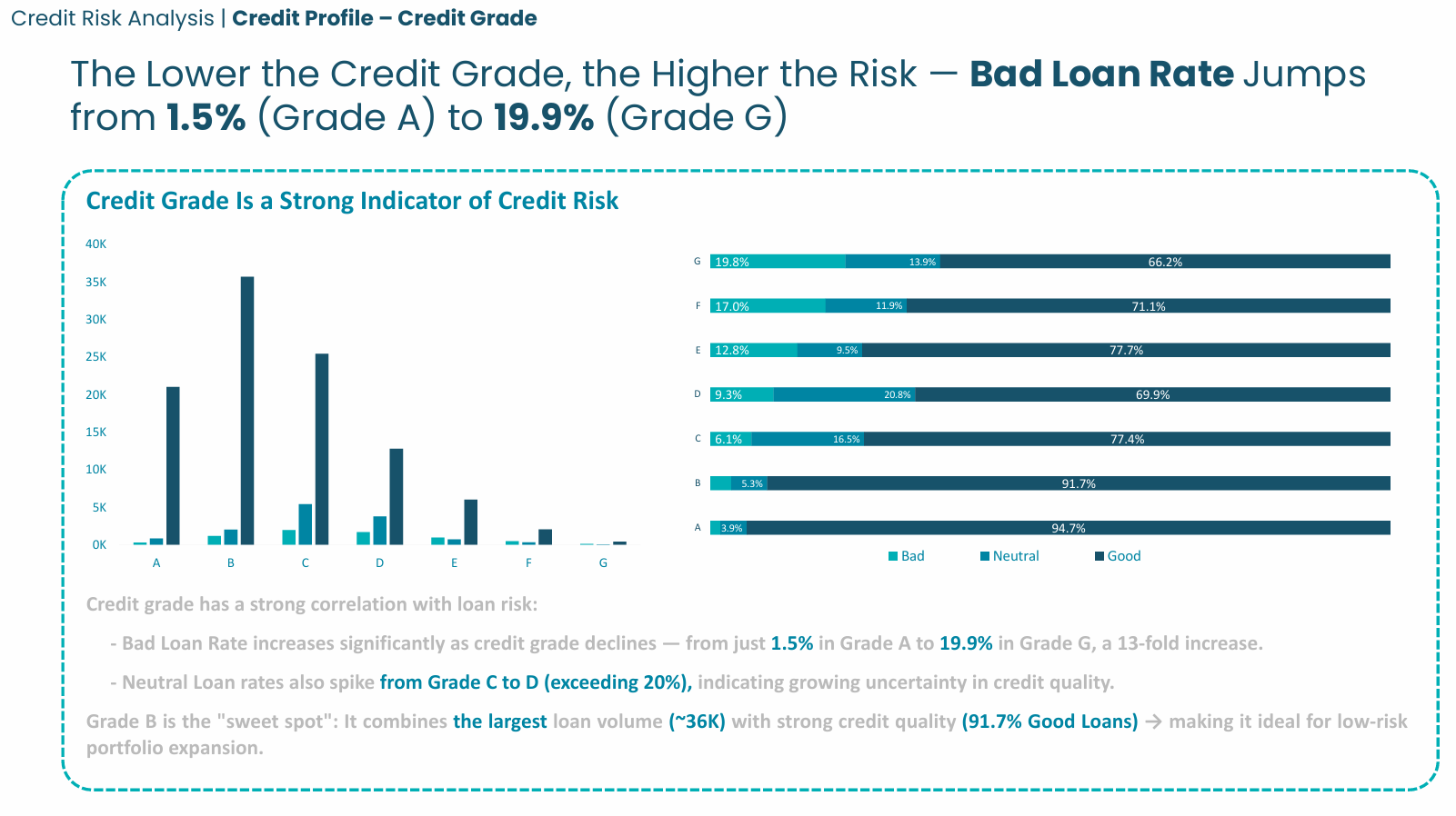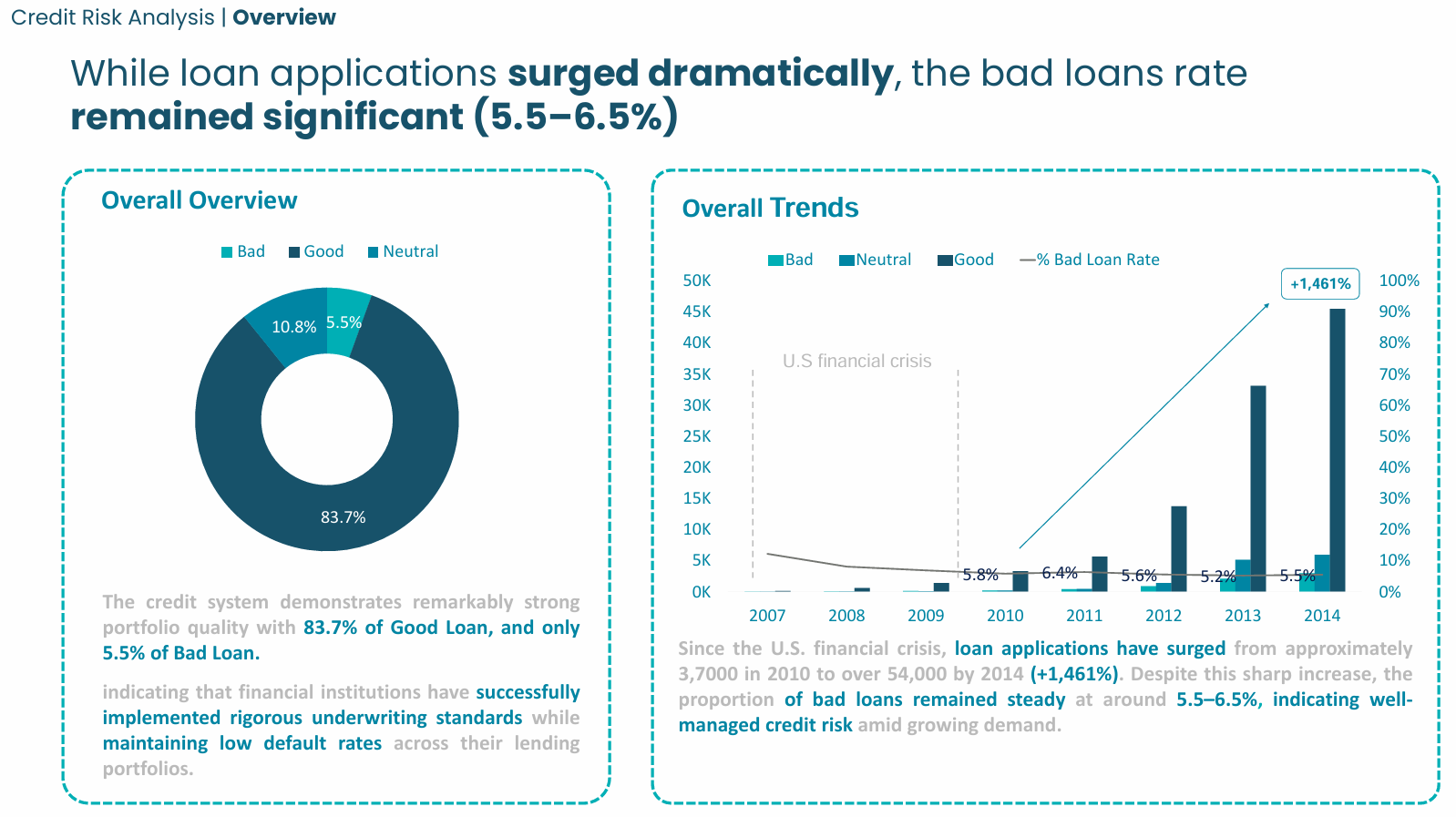 The project focused on analyzing credit risk in a peer-to-peer lending platform using historical loan data from 2007 to 2014. In response to the post-crisis surge in loan applications, using Power BI explores loan records and identifies behavioral patterns that distinguish good loans from bad ones based on credit profile, debt management pattern, financial capability and loan structure. The goal was to provide data-driven insights and recommendations to help reduce default risk and improve lending strategies through better borrower segmentation and risk monitoring.