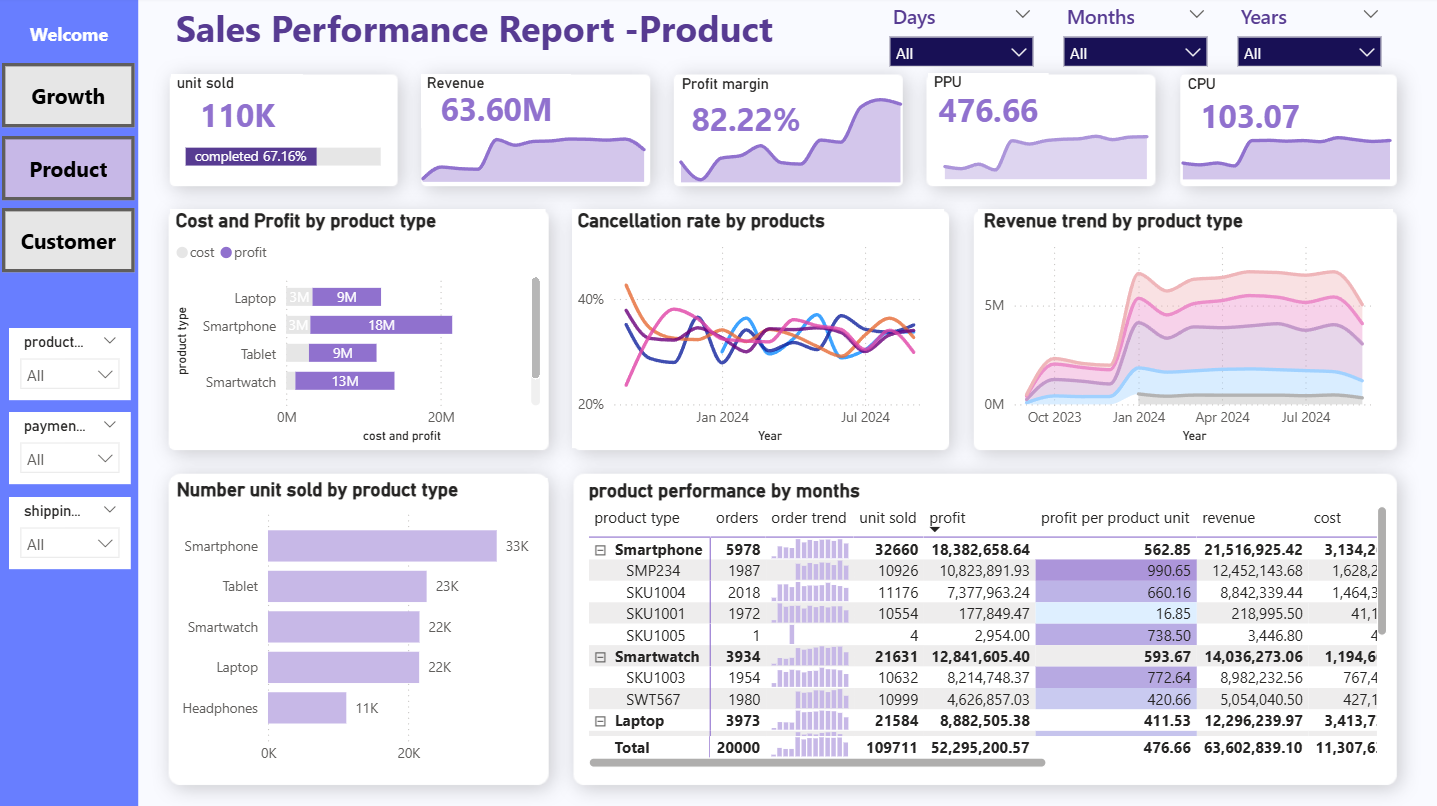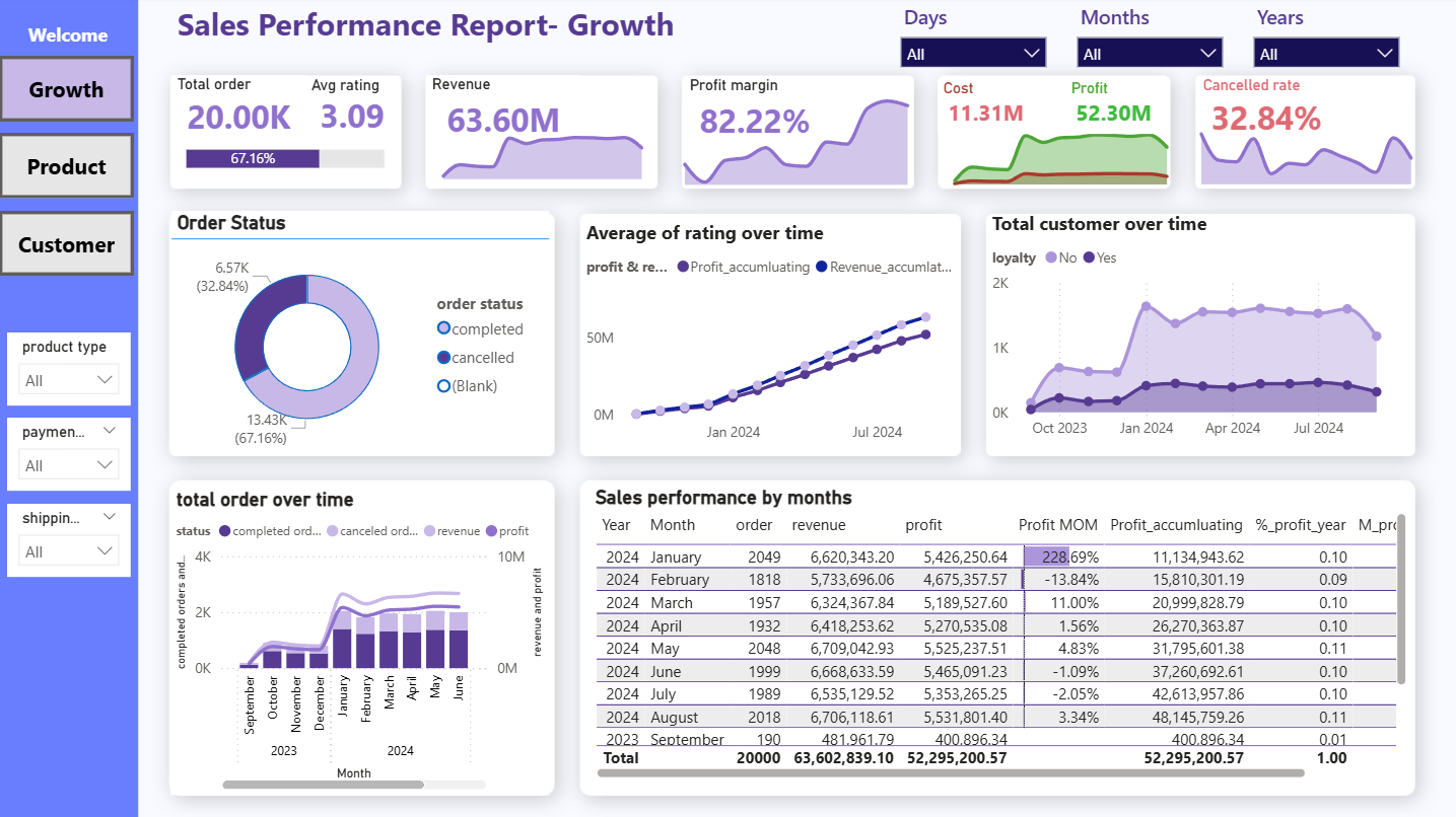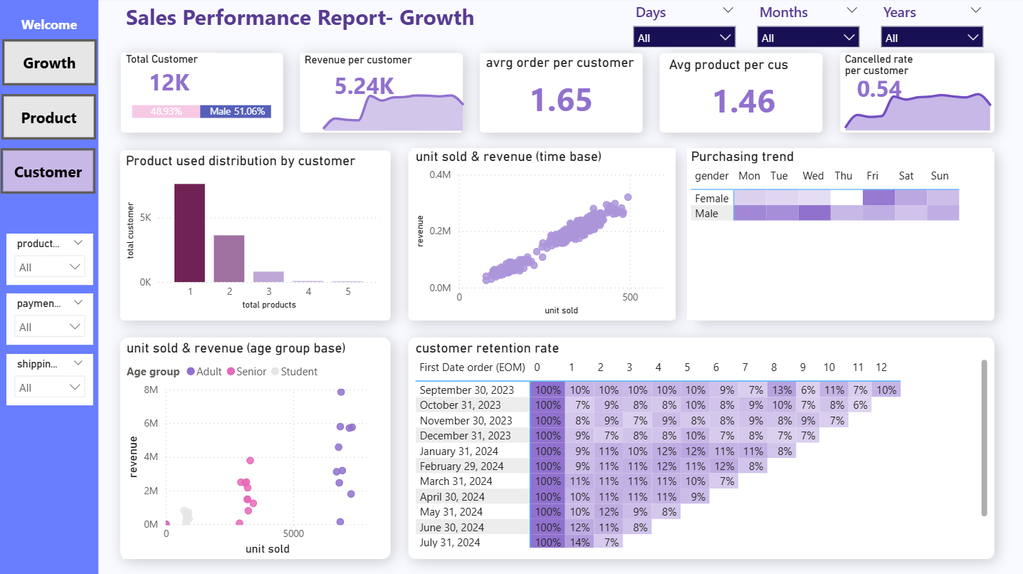 The project presents a sales performance dashboard built with Power BI to explore business trends and customer behavior. It provides a holistic view of sales performance across products, customer segments, and time periods. The dashboard uncovers insights related to growth, loyalty, and operational efficiency. Interactive visualizations support deeper exploration and faster decision-making. The analysis helps optimize strategies and improve overall business outcomes.