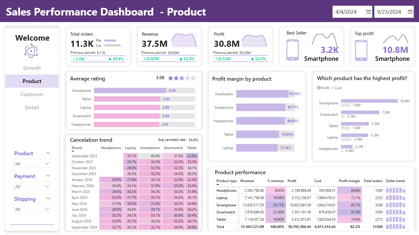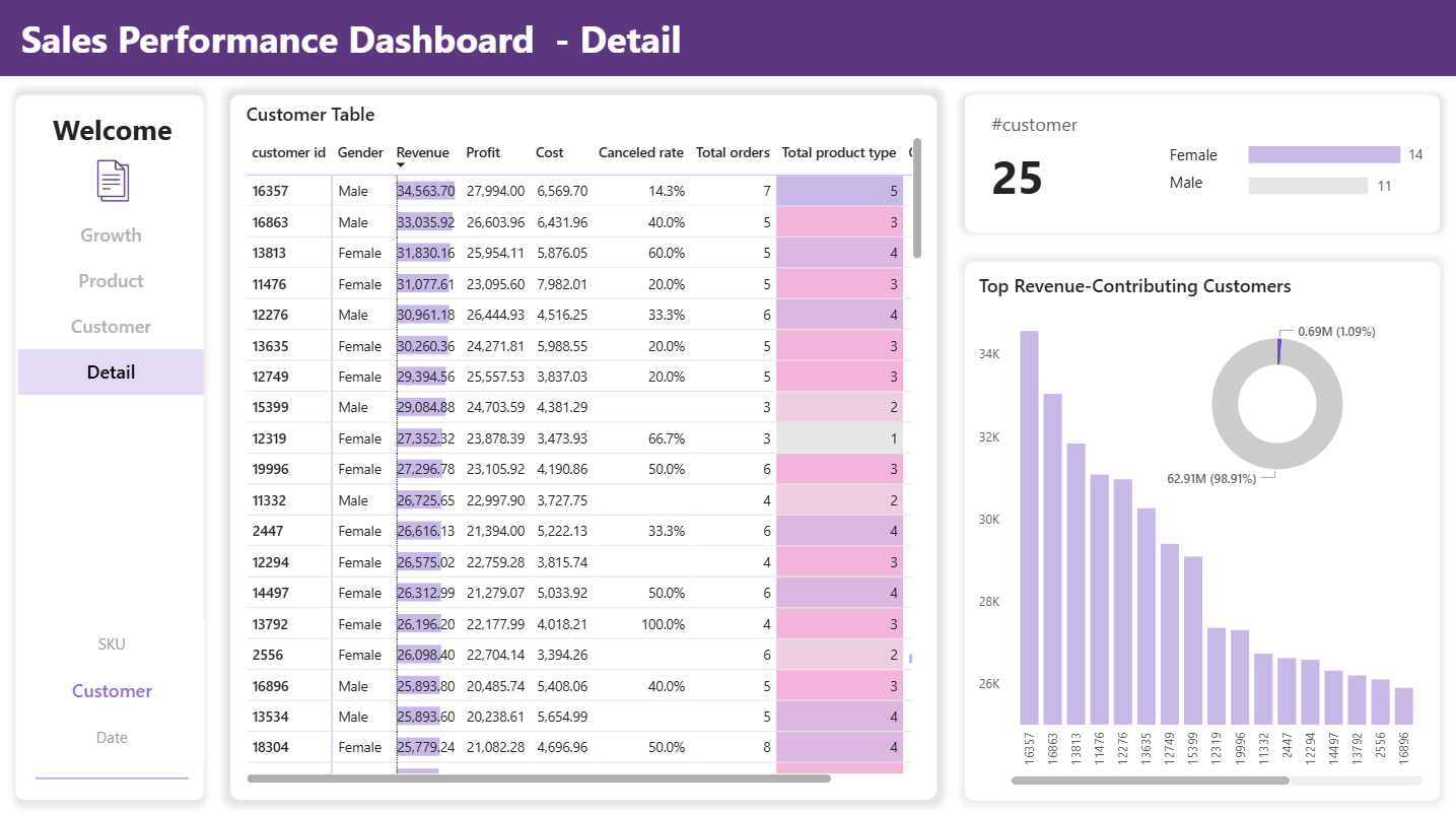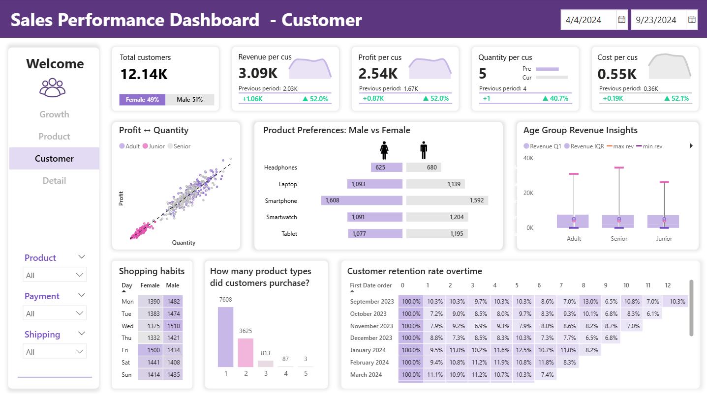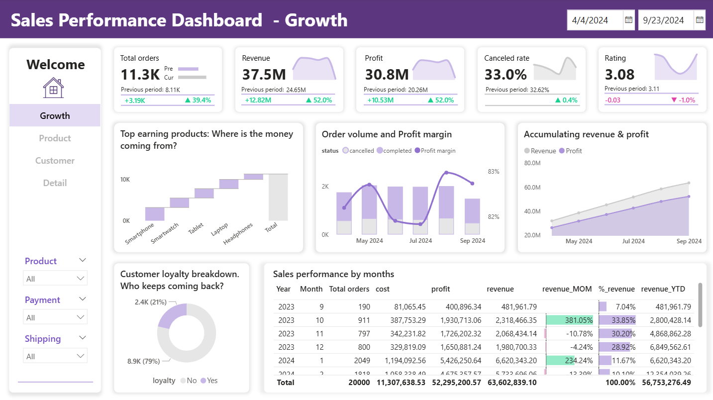 The project presents a sales performance dashboard built with Power BI to explore business trends and customer behavior. It provides a holistic view of sales performance across products, customer segments, and time periods. The dashboard uncovers insights related to growth, loyalty, and operational efficiency. Interactive visualizations support deeper exploration and faster decision-making. The analysis helps optimize strategies and improve overall business outcomes.
