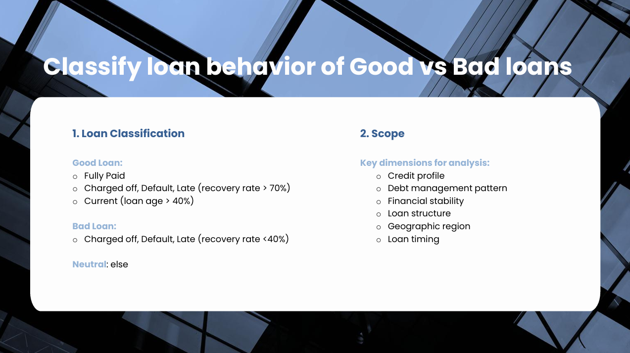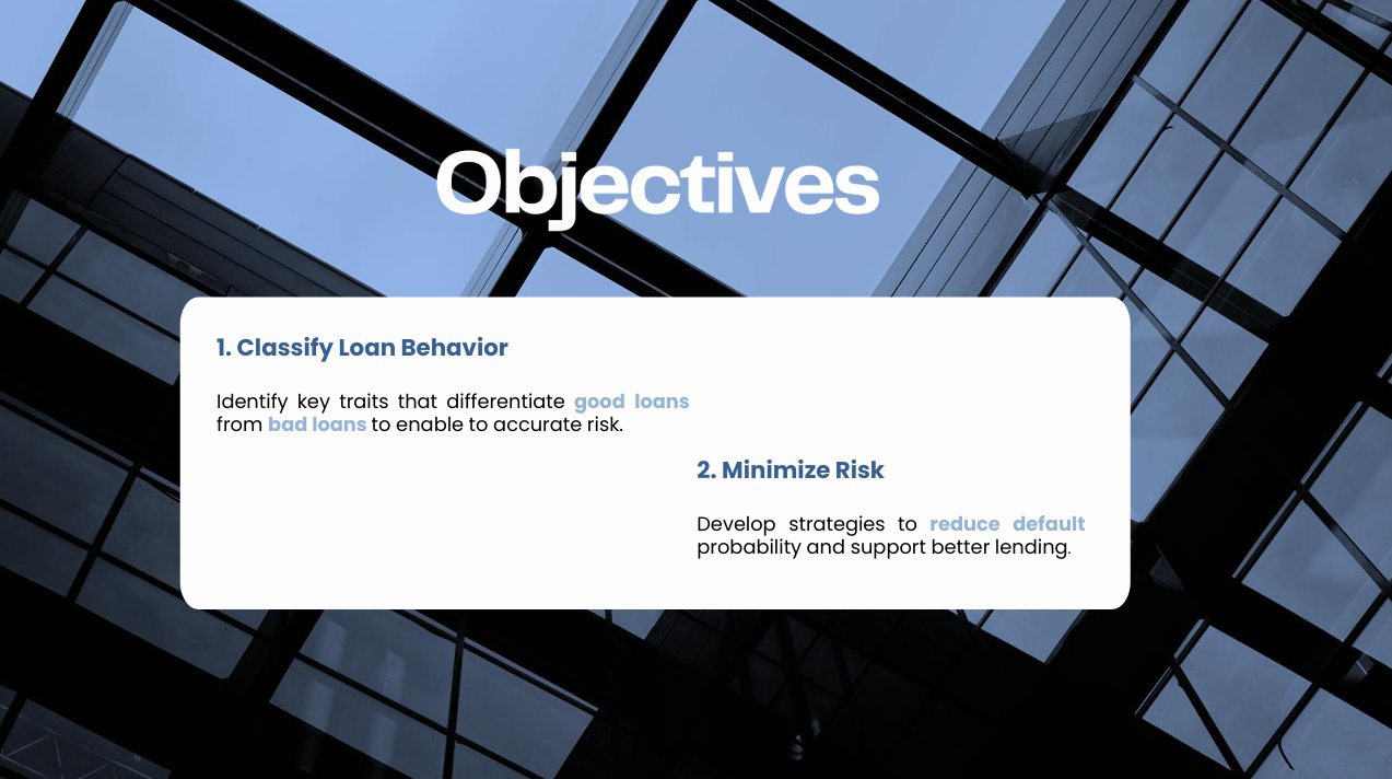 Define credit risk objectives & metrics (default rate, recovery rate, credit grade) to evaluate loan portfolio quality.