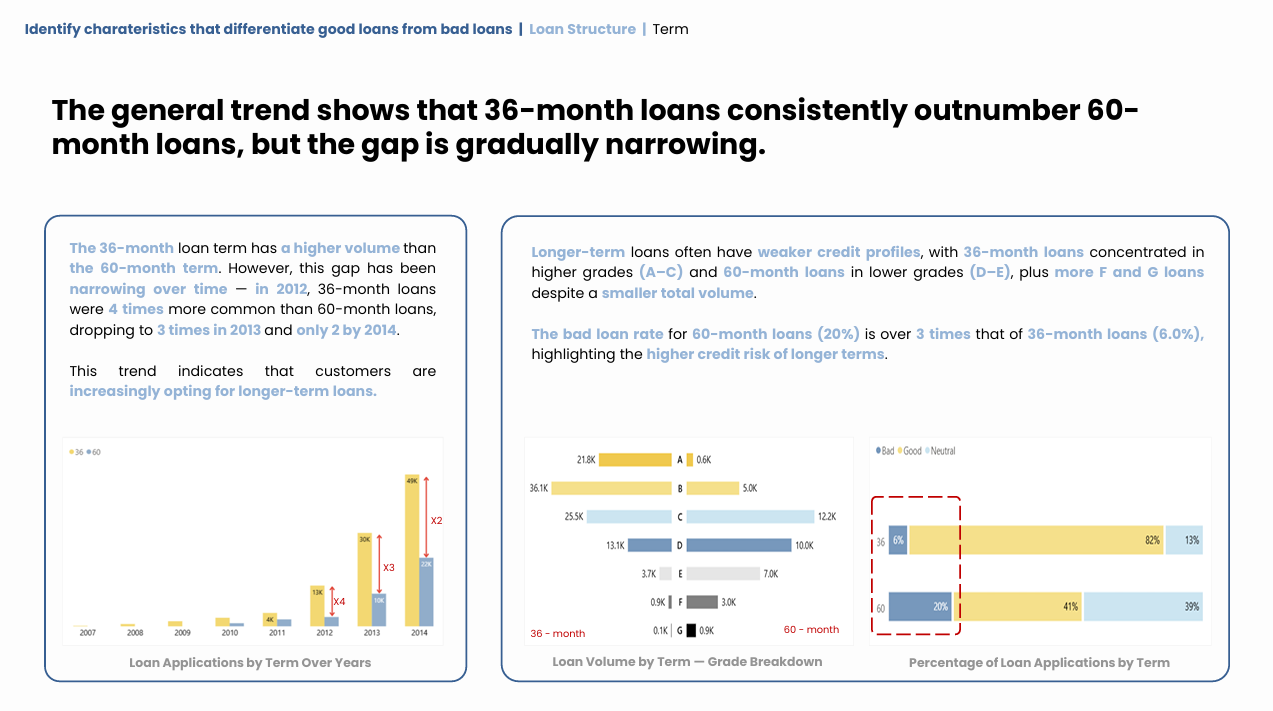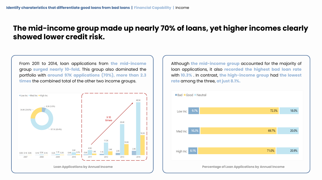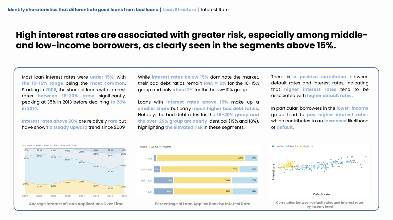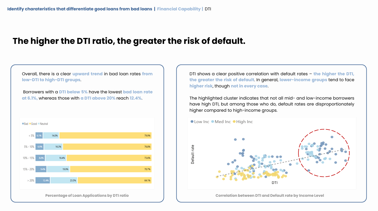 Analyze & visualize borrower risk patterns in Power BI by credit profile, DTI, term, interest rate, and income.