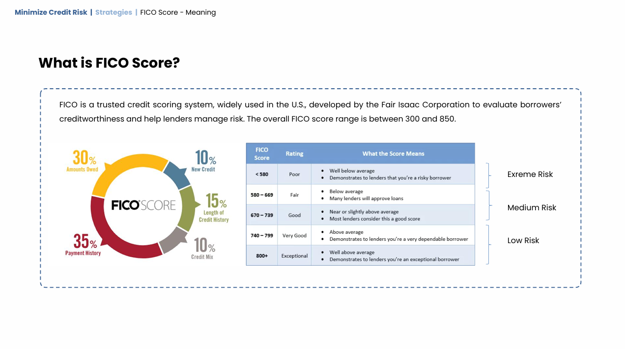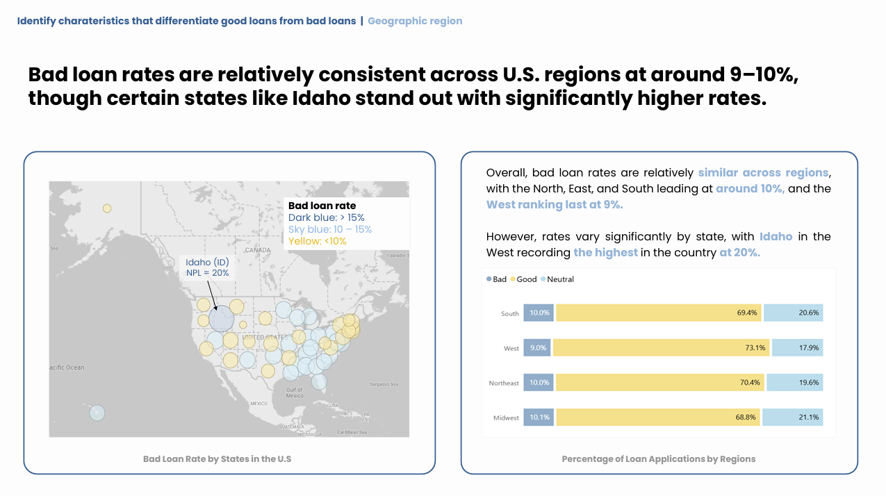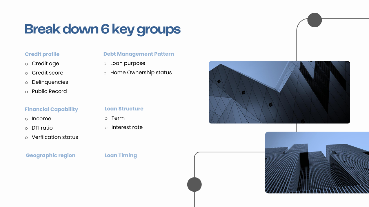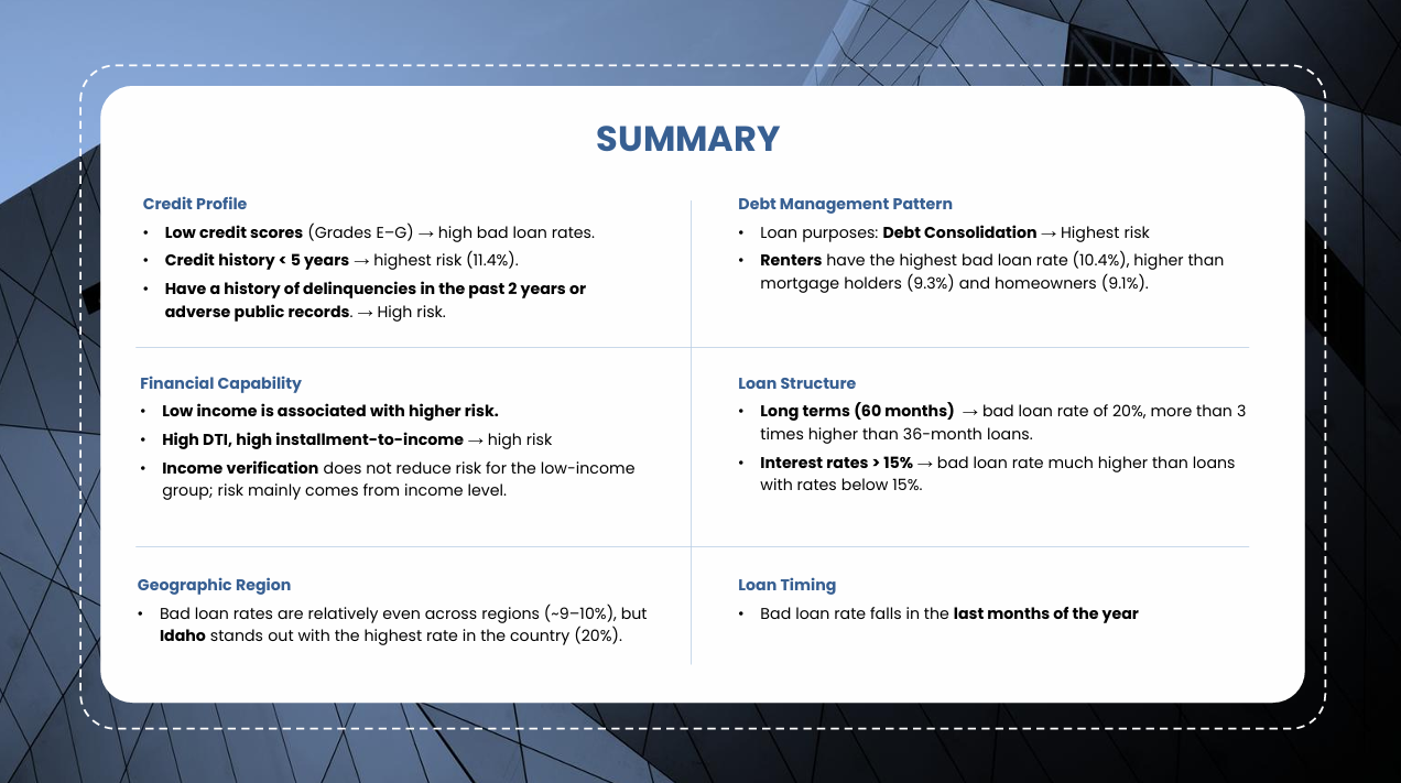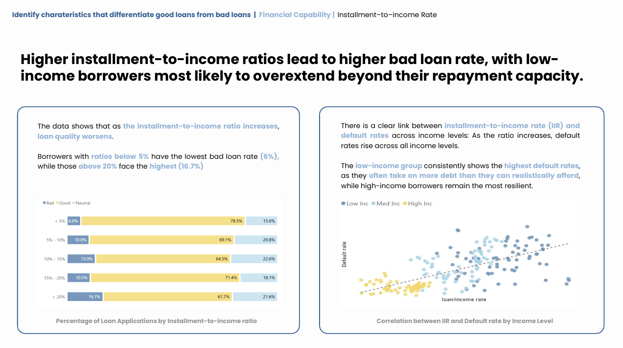 Analyze & visualize borrower risk patterns in Power BI by credit profile, DTI, term, interest rate, and income.