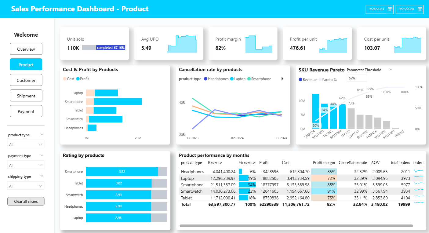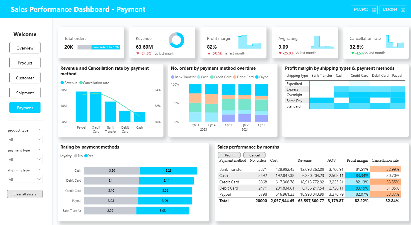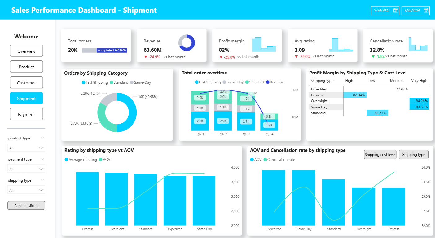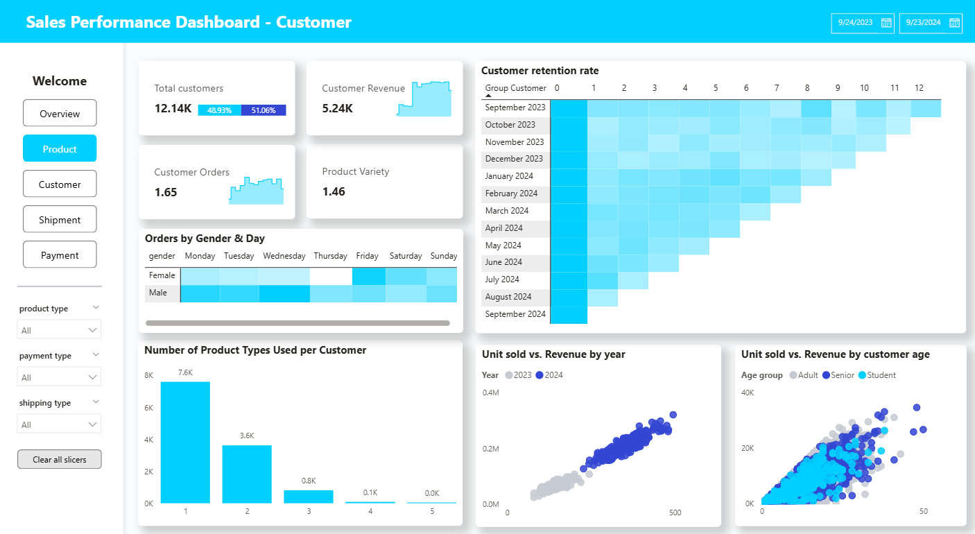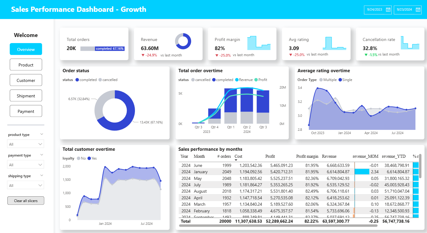 The project presents a sales performance dashboard built with Power BI to explore business trends and customer behavior. It provides a holistic view of sales performance across products, customer segments, and time periods. The dashboard uncovers insights related to growth, loyalty, and operational efficiency. Interactive visualizations support deeper exploration and faster decision-making. The analysis helps optimize strategies and improve overall business outcomes.