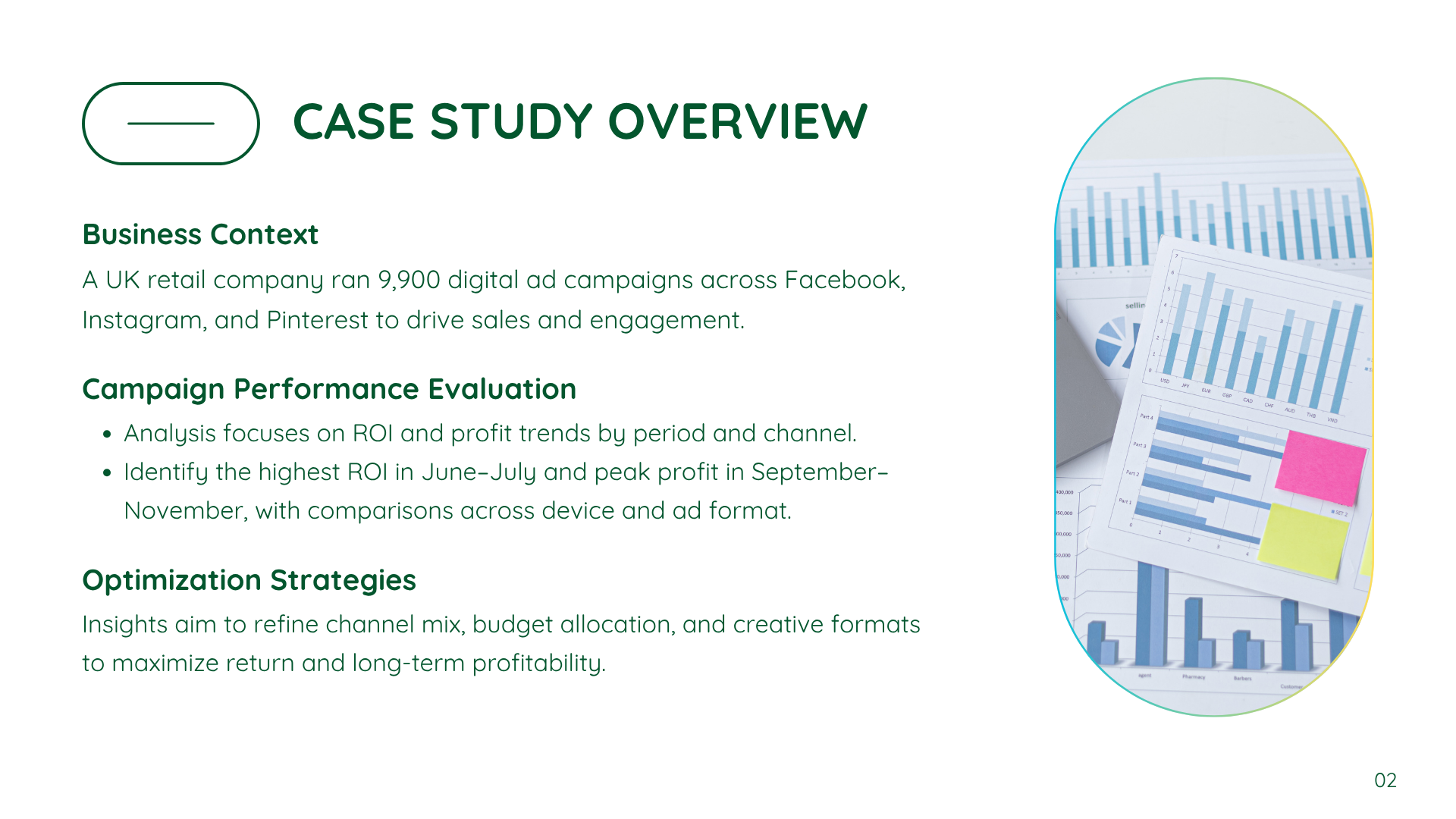 The Marketing Campaign Analytics dataset contains 9,900 records of digital ads run across Facebook, Instagram, and Pinterest in the UK. It includes campaign attributes, devices, geo locations, ad formats, and performance metrics such as impressions, clicks, CTR, conversions, spend, CPC, ROI, and profit. Learners can analyze channel efficiency, device behavior, geo-level performance, seasonal trends, engagement impact, and budget effectiveness. The dataset supports identifying ROI drivers, diagnosing diminishing returns, and generating insights to optimize marketing strategy and allocation.