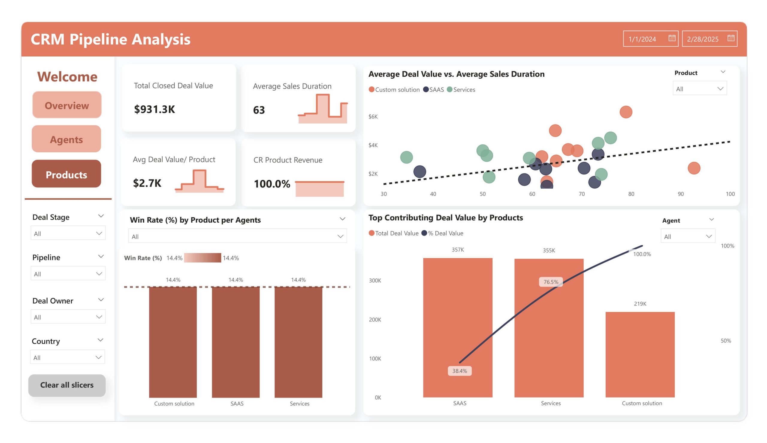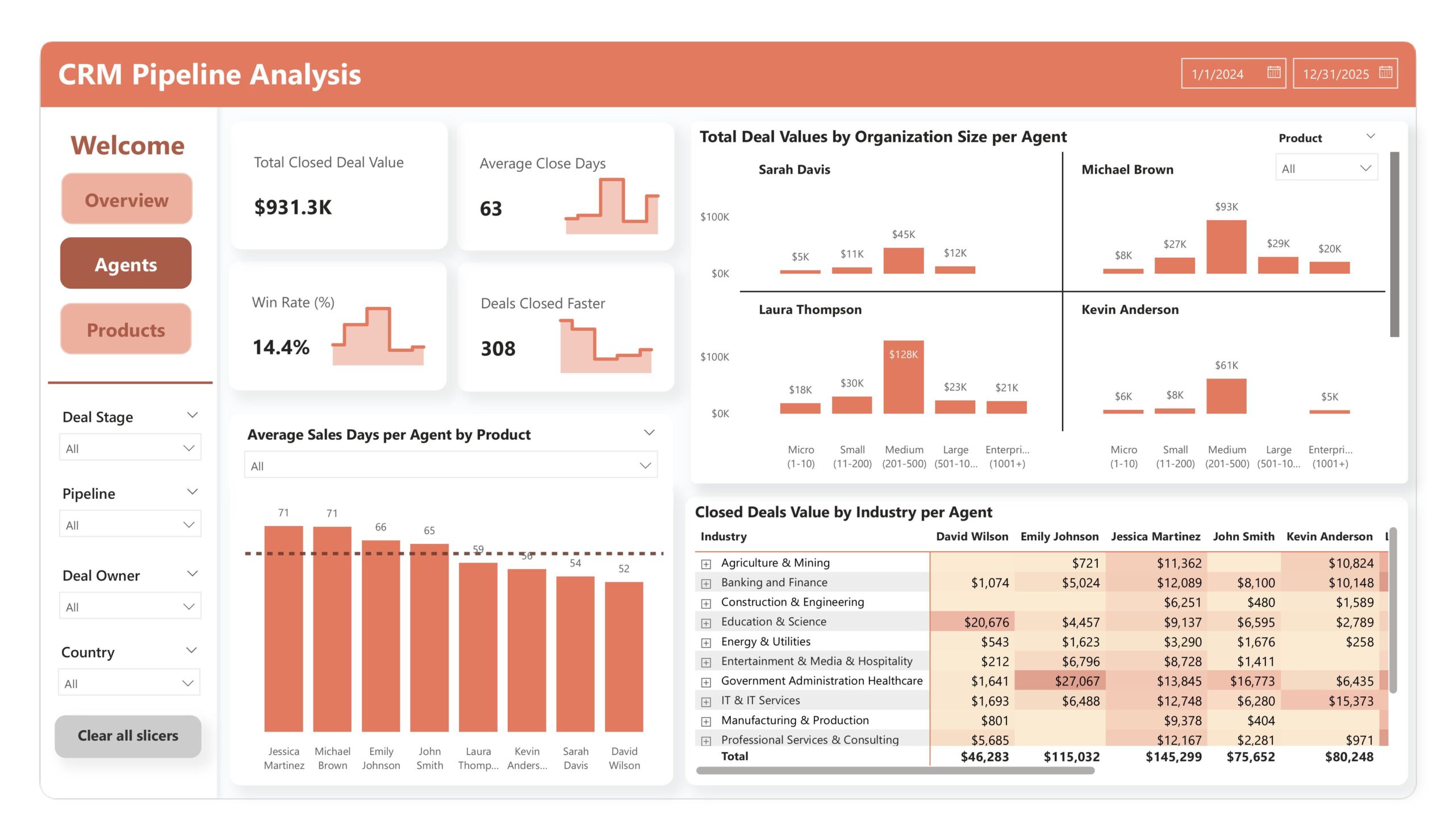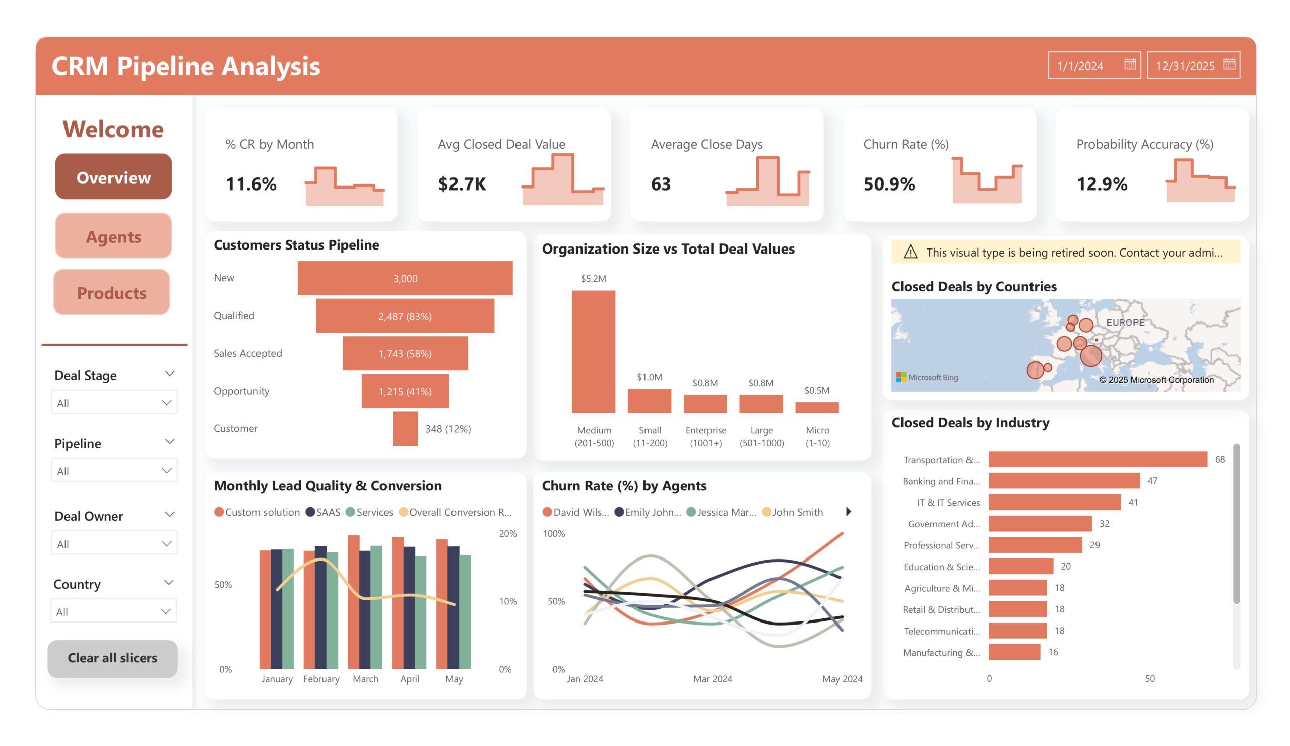 The CRM Sales Analytics dataset contains 3,000 B2B sales records and multiple supporting dimensions, modeling the full sales pipeline from lead acquisition to customer conversion. It captures key attributes such as industry, deal value, sales agent performance, probability scoring, product type, and organization size. Learners can act as CRM/Sales Analysts to evaluate conversion rates, identify high-value segments, assess sales cycle efficiency, analyze agent performance, and uncover churn risks supporting data-driven decisions for improving sales strategy and revenue forecasting.