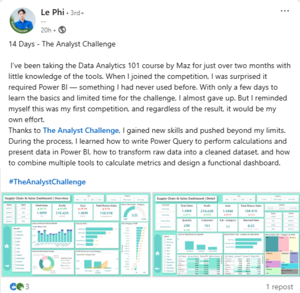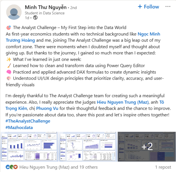 The team created this challenge with the goal of providing a space for everyone to practice and learn, so certificates will not be issued. However, the winners will receive prizes along with support to build their portfolio on the MAZHOCDATA website.